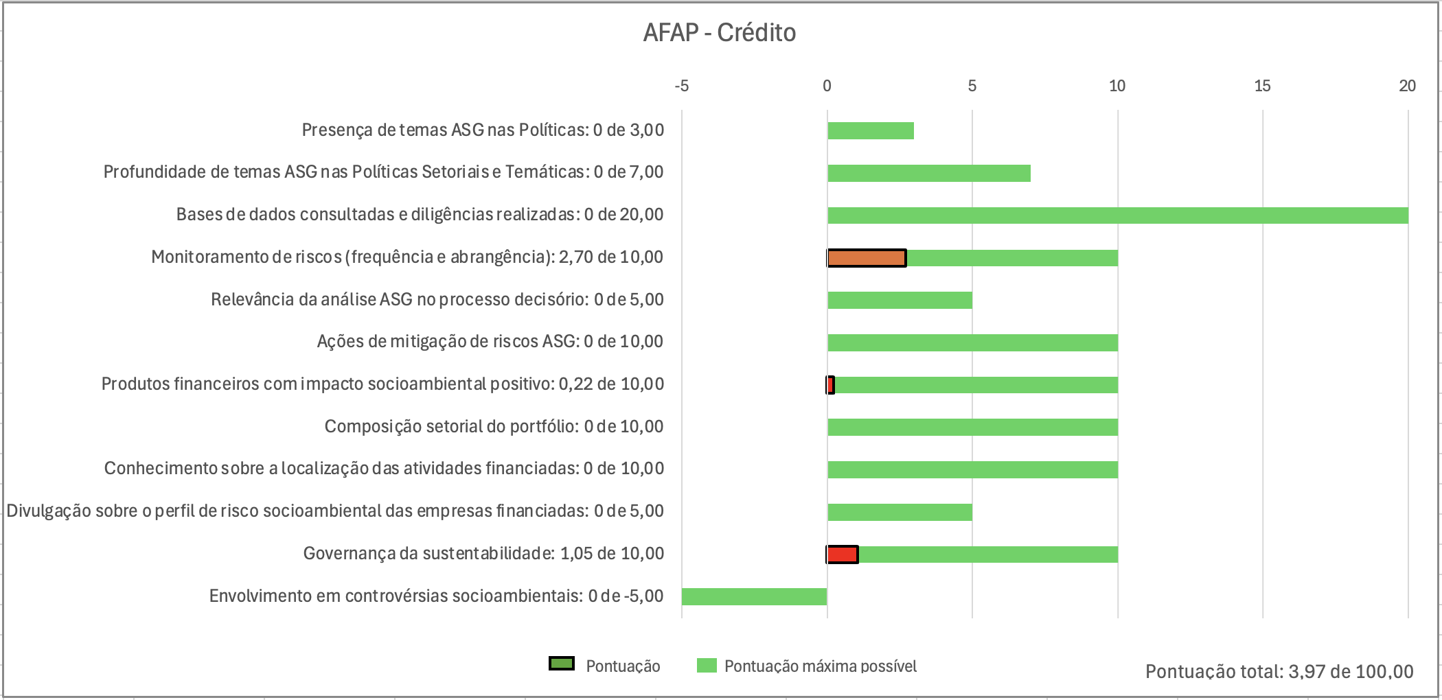 Como pontos negativos (notas abaixo da média das demais IFDs), pode-se apontar a cobertura temática das Políticas, a falta de Políticas setoriais, falta de transparência quanto à composição setorial de seu portfólio, as bases de dados consultadas, ações de mitigação de riscos socioambientais, produtos financeiros com impacto positivo, conhecimento sobre a localização das atividades financiadas e Governança.