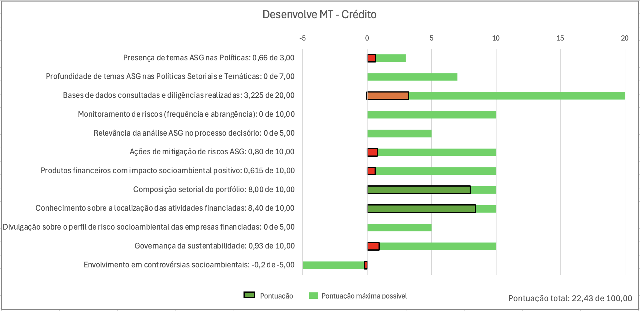 A Desenvolve MT apresenta desempenho positivo em relação ao detalhamento da composição setorial do portfólio e conhecimento sobre a localização das atividades financiadas. Como pontos negativos, destacam-se todos os itens relativos a Gerenciamento de Riscos Socioambientais, o que significa que há grandes riscos de a agência estar financiando empreendimentos com impactos socioambientais negativos.