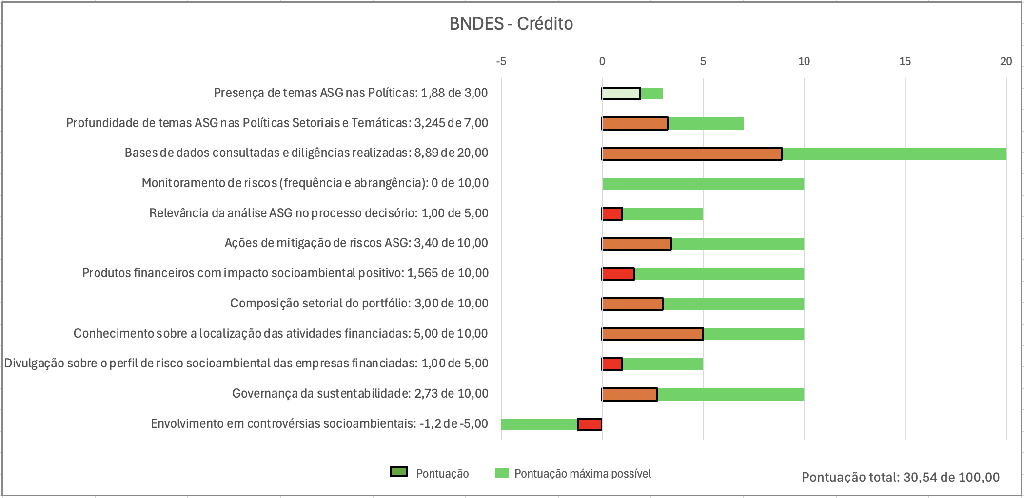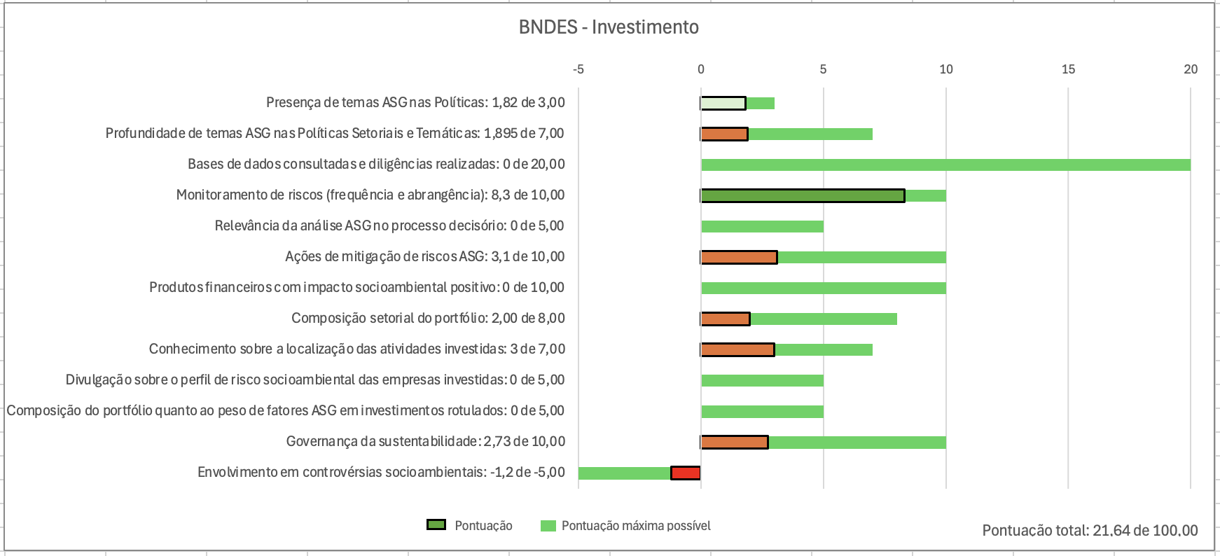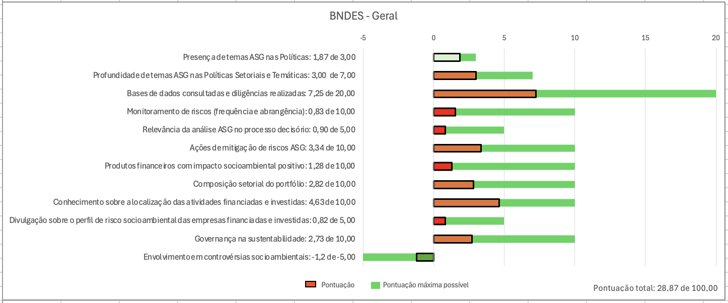Como pontos negativos, destaca-se a falta de transparência sobre monitoramento de riscos socioambientais e o envolvimento em controvérsias socioambientais, mas esse último item é bastante natural por se tratar da única instituição com atuação em nível nacional.