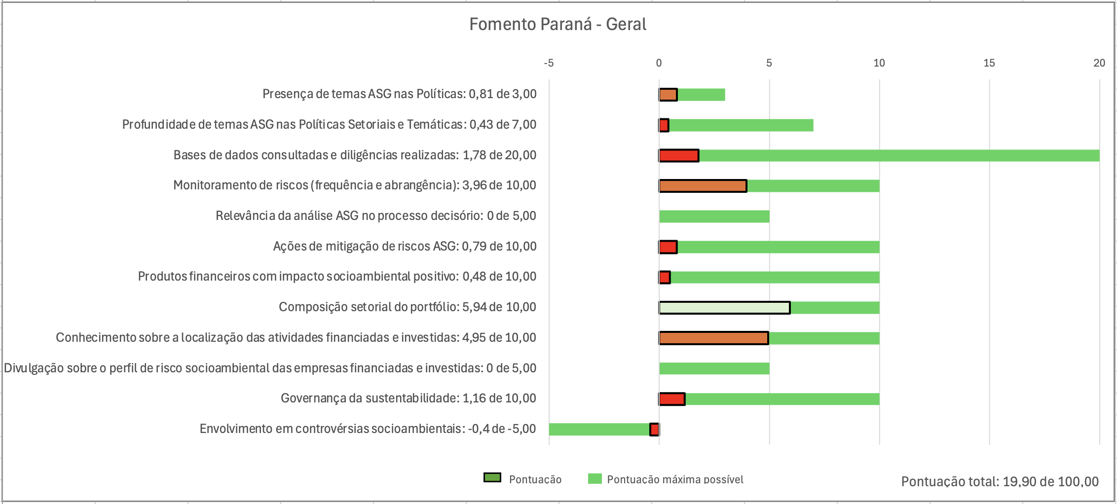A Fomento Paraná apresenta como destaque positivo o detalhamento da composição setorial do seu portfólio e o conhecimento sobre a localização das atividades financiadas, além de apresentar diversos produtos financeiros com impacto ambiental ou social positivo.