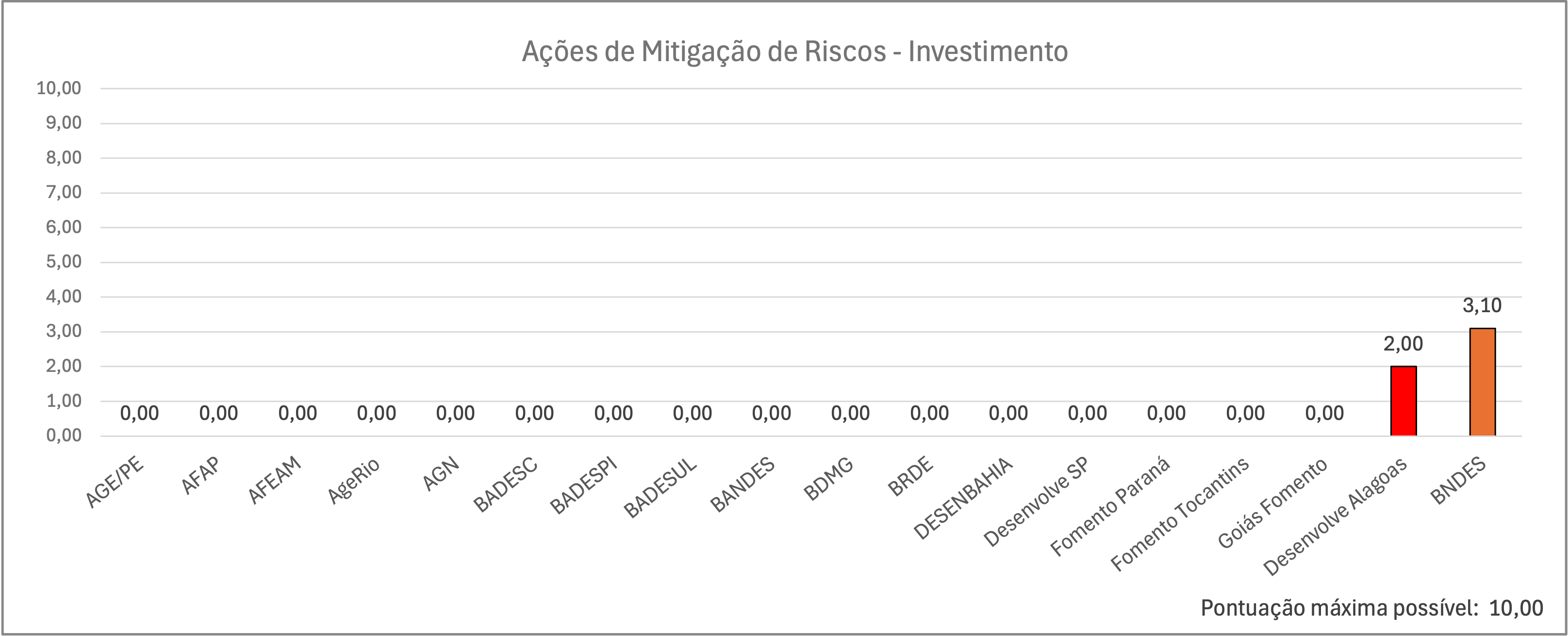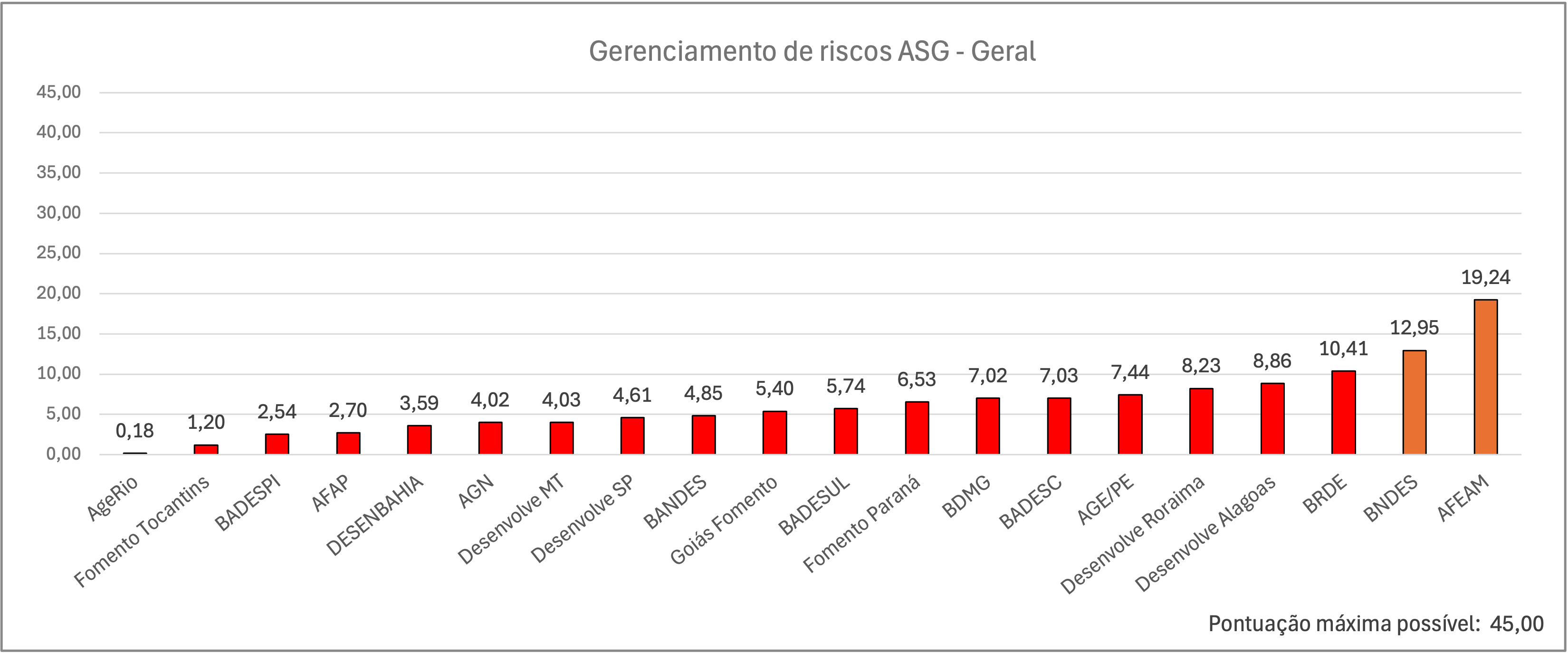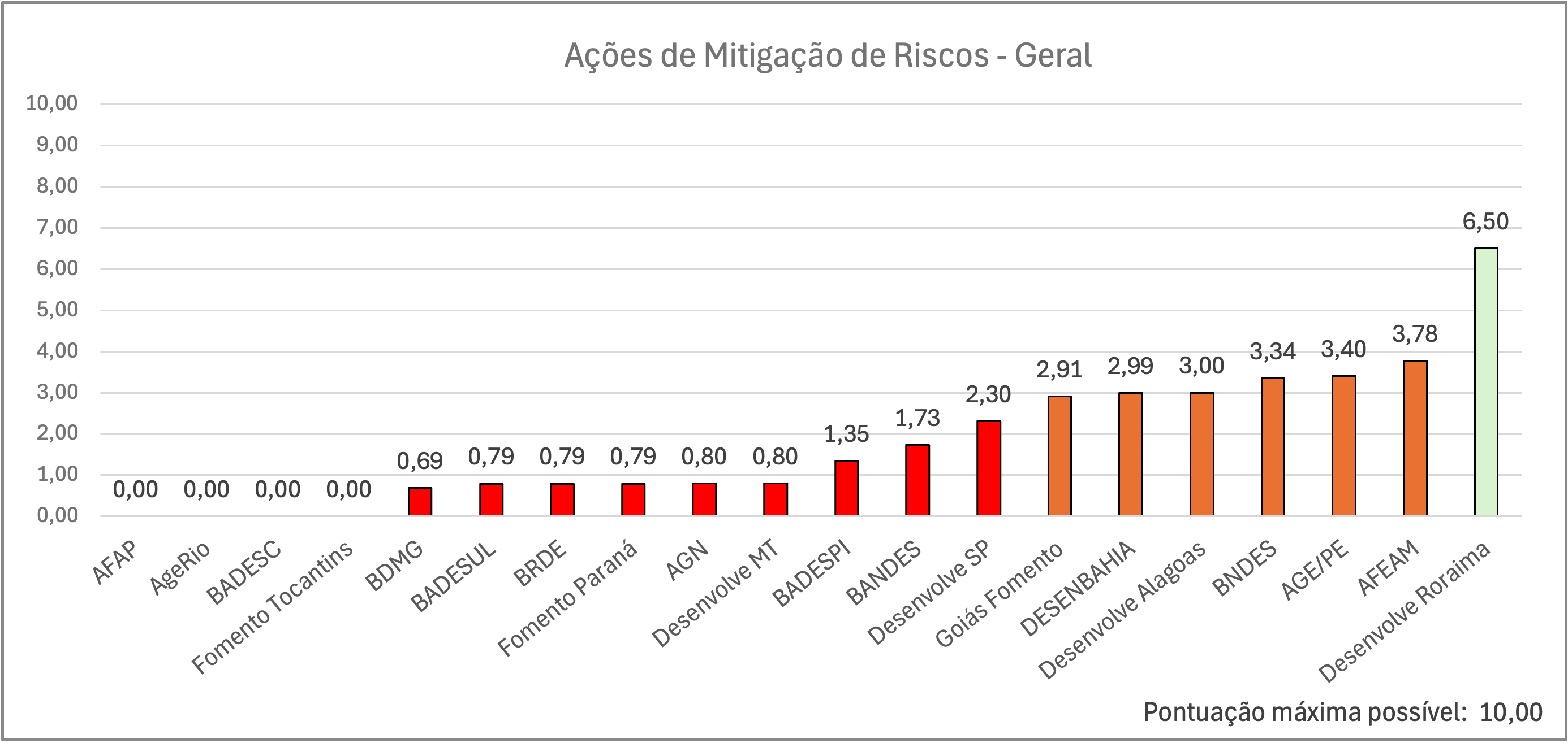 Veja a seguir os Rankings gerais de Gerenciamento de Riscos ASG (abrangendo Bases de dados consultadas, Relevância da avaliação de riscos ASG no processo decisório, Monitoramento de riscos ASG e Mitigação de riscos ASG) com a pontuação geral de cada IFD, a pontuação em crédito e em investimentos. Observe-se que crédito e investimentos têm pesos distintos, proporcionais ao valor do portfólio respectivo (excluindo títulos públicos, para investimentos), conforme dados constantes das últimas demonstrações contábeis publicadas nos respectivos sites. Duas IFDs (Desenvolve MT e Desenvolve Roraima) não possuem notas para investimentos por não investirem em títulos privados: