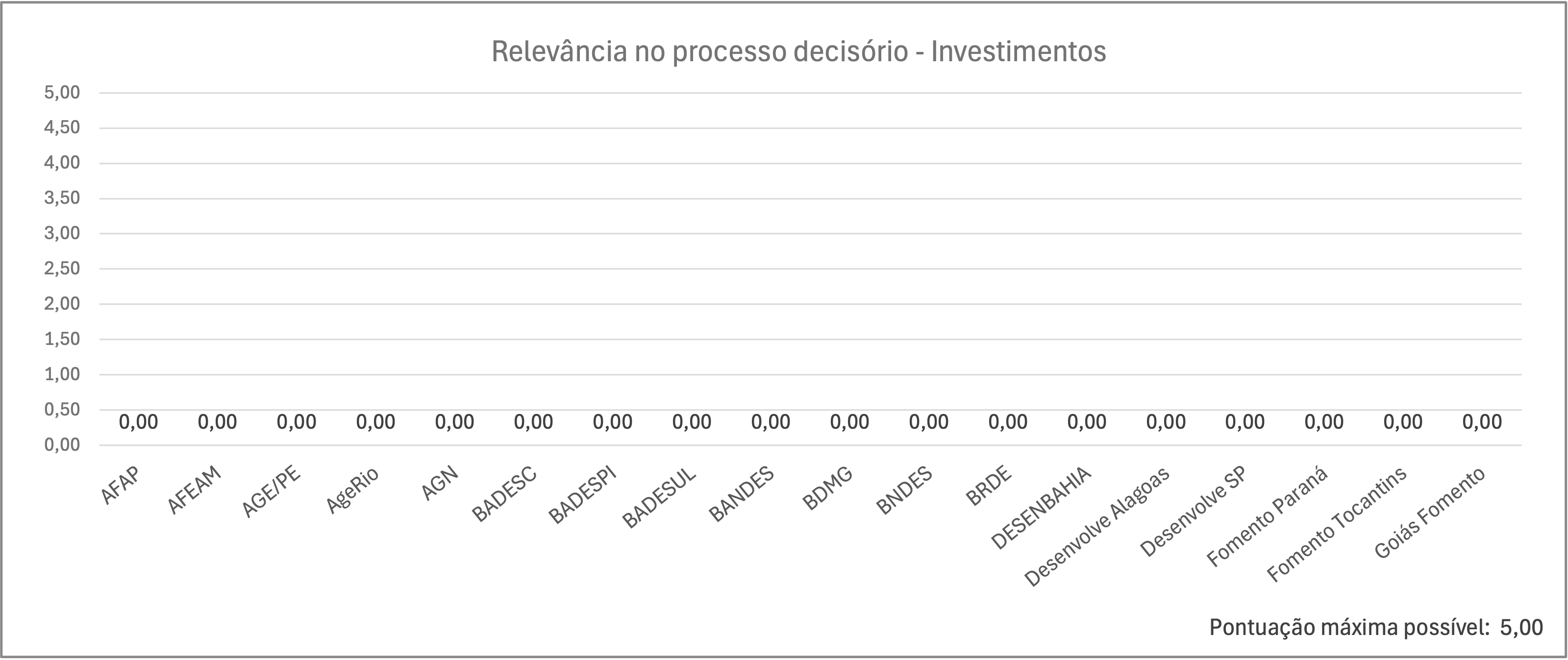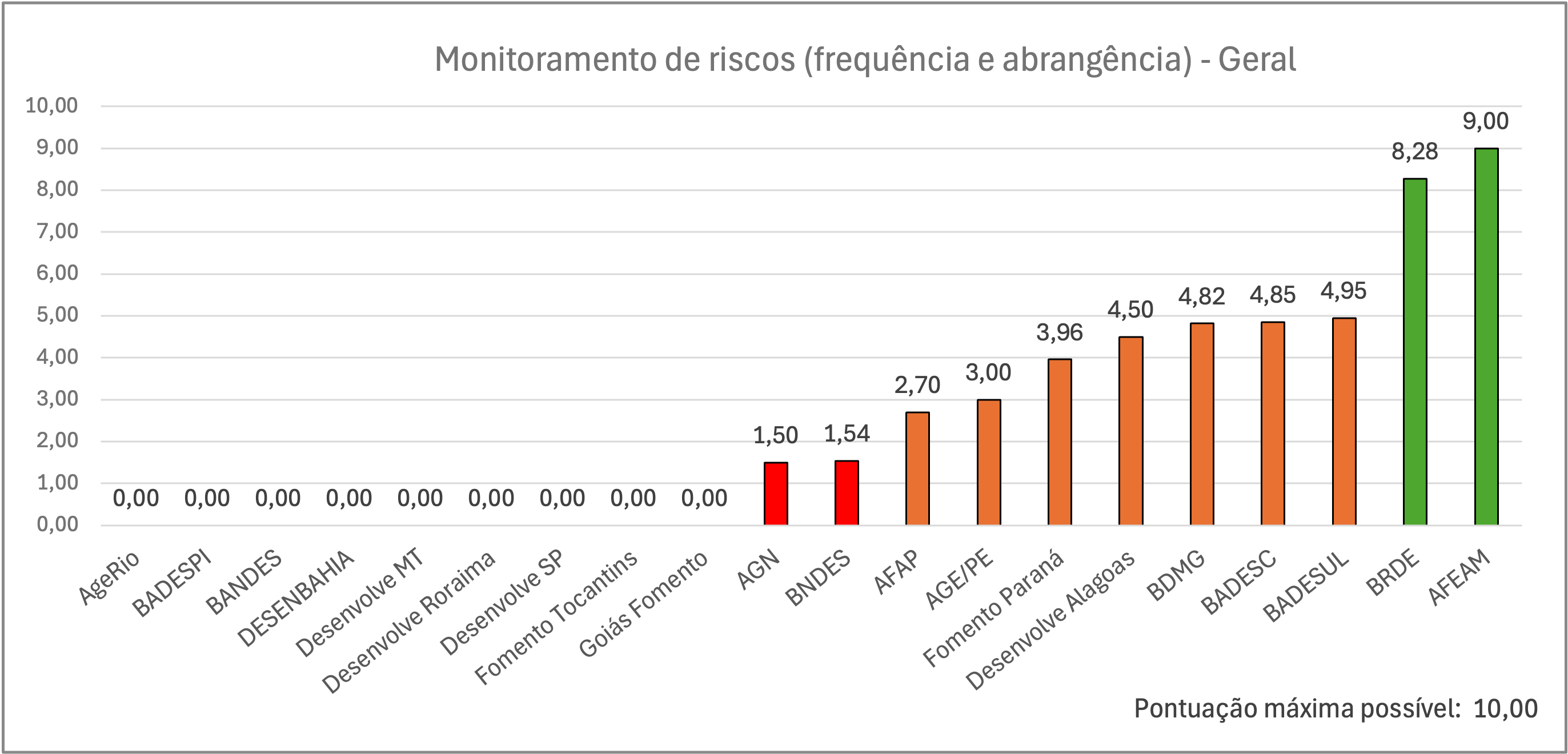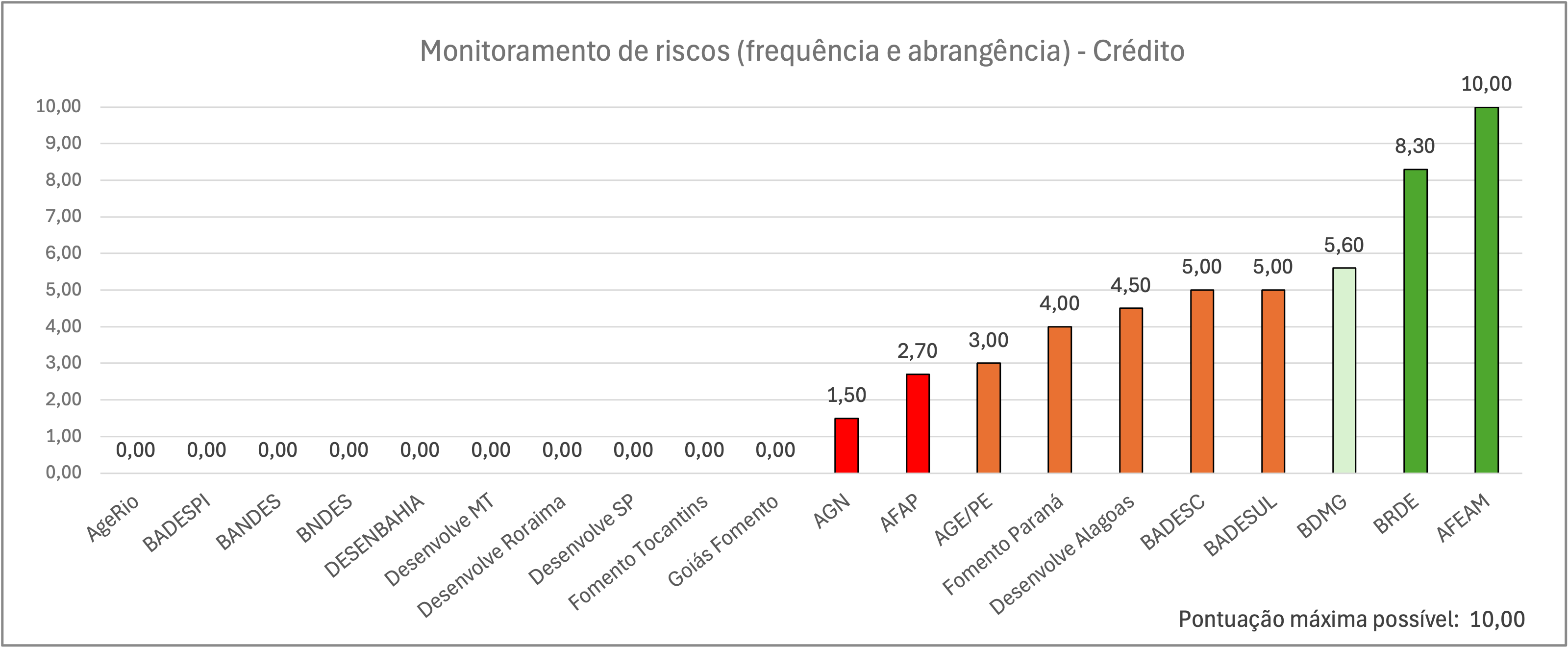 Veja a seguir os Rankings gerais de Gerenciamento de Riscos ASG (abrangendo Bases de dados consultadas, Relevância da avaliação de riscos ASG no processo decisório, Monitoramento de riscos ASG e Mitigação de riscos ASG) com a pontuação geral de cada IFD, a pontuação em crédito e em investimentos. Observe-se que crédito e investimentos têm pesos distintos, proporcionais ao valor do portfólio respectivo (excluindo títulos públicos, para investimentos), conforme dados constantes das últimas demonstrações contábeis publicadas nos respectivos sites. Duas IFDs (Desenvolve MT e Desenvolve Roraima) não possuem notas para investimentos por não investirem em títulos privados: