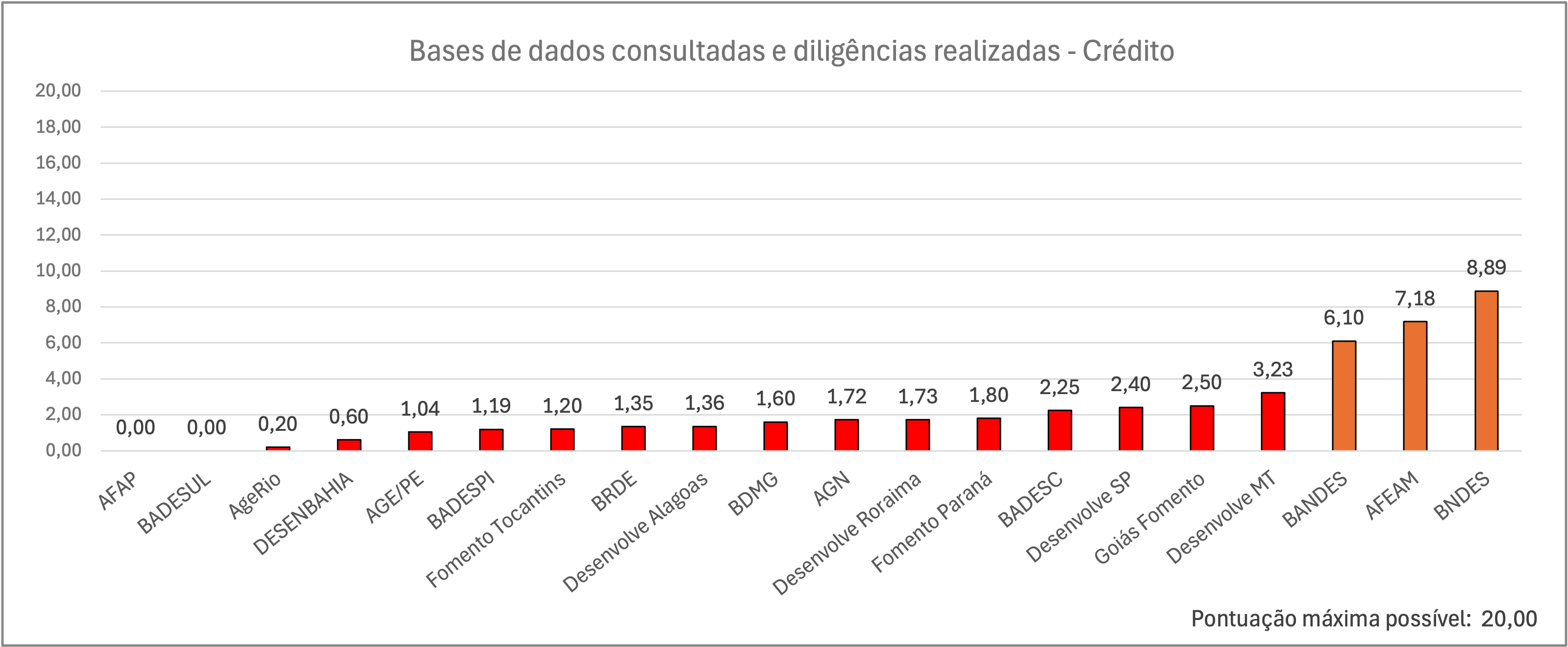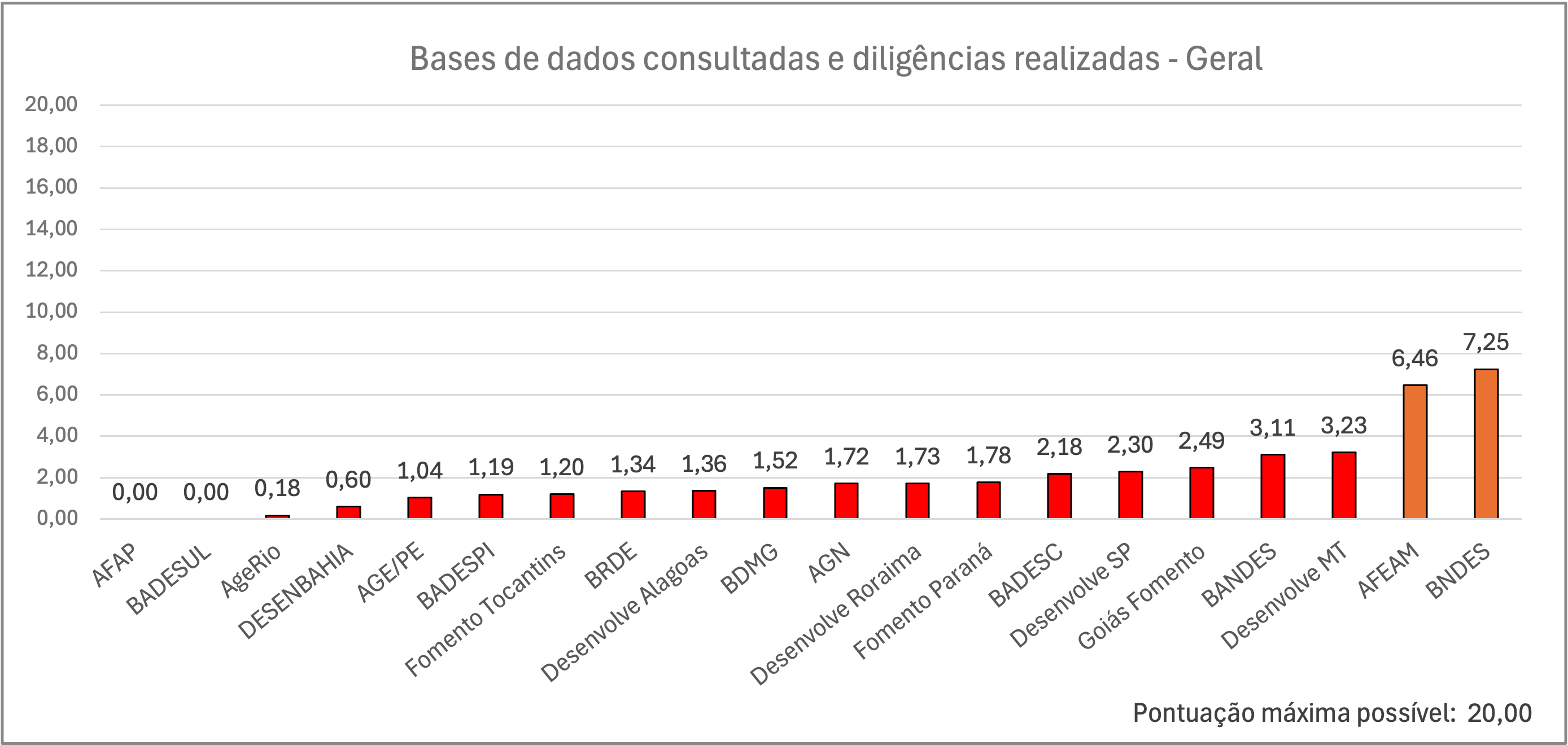 O acesso às páginas individuais das IFDs (coluna da esquerda em azul), com as Tabelas de pontuação item a item e as planilhas Excel com pontuação e justificativas, permitirá perceber que esse tema-chave é um dos pontos fracos das IFDs. Mesmo para temas que constam nas Políticas (o exemplo clássico é trabalho infantil), não ocorre a consulta às bases de dados correspondentes (ver tabela de correlação). Outro tema que costuma constar em quase todas as Políticas é Desmatamento, mas a grande maioria das IFDs nem sequer consulta áreas embargadas por órgãos ambientais estaduais – fazem isso apenas com a base de dados do IBAMA, sendo que a competência para o tema é compartilhada com os Estados, havendo Estados em que o órgão ambiental estadual chega a embargar dez vezes mais áreas do que o IBAMA. Ignorar que o Brasil é uma Federação e que as competências (poderes-deveres) de atuar em matéria ambiental são primariamente dos Estados, limitando a consulta a bases de dados federais, é prática comum. Essa abordagem rasa na identificação de riscos socioambientais se reflete nas baixas pontuações.